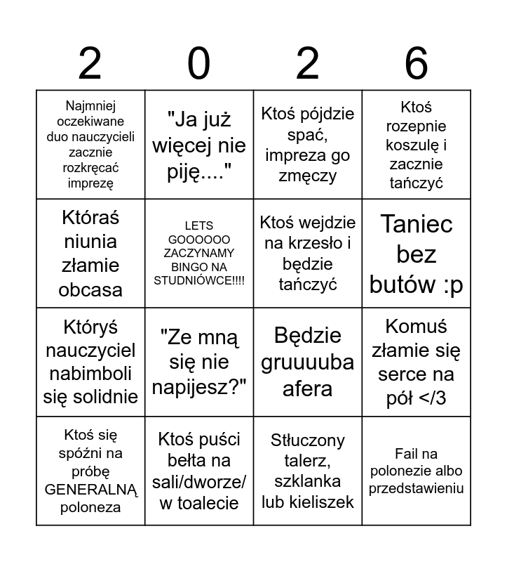 This bingo card has 16 words: Ktoś puści bełta na sali/dworze/ w toalecie, Komuś złamie się serce na pół </3, Ktoś pójdzie spać, impreza go zmęczy, Najmniej oczekiwane duo nauczycieli zacznie rozkręcać imprezę, Któryś nauczyciel nabimboli się solidnie, "Ja już więcej nie piję....", Będzie gruuuuba afera, Stłuczony talerz, szklanka lub kieliszek, Któraś niunia złamie obcasa, LETS GOOOOOO ZACZYNAMY BINGO NA STUDNIÓWCE!!!!, Ktoś się spóźni na próbę GENERALNĄ poloneza, Ktoś rozepnie koszulę i zacznie tańczyć, "Ze mną się nie napijesz?", Taniec bez butów :p, Ktoś wejdzie na krzesło i będzie tańczyć and Fail na polonezie albo przedstawieniu.