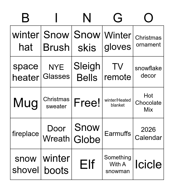 This bingo card has a free space and 38 words: 2026 Planner, Scarf, Tree Star, NYE Glasses, 2026 Calendar, Door Wreath, Sleigh Bells, Gift Wrapping Paper, Christmas ornament, TV remote, Christmas sweater, Winter gloves, Icicle, Hot Chocolate Mix, space heater, fireplace, ice skates, Snow skis, sled, winter/Heated blanket, winter hat, winter boots, snowflake decor, snow shovel, Stocking, Elf, Snowman, Hand Cream, Cold Medicine, Christmas Lights, Winter Candle, Snow Globe, Something With A snowman, Snow Brush, Marshmallows, Earmuffs, Mug and Boots.