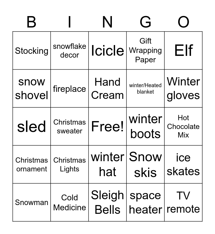 This bingo card has a free space and 24 words: Christmas Lights, Cold Medicine, Hand Cream, Snowman, Elf, Stocking, snow shovel, snowflake decor, winter boots, winter hat, winter/Heated blanket, sled, Snow skis, ice skates, fireplace, space heater, Hot Chocolate Mix, Icicle, Winter gloves, Christmas sweater, TV remote, Christmas ornament, Gift Wrapping Paper and Sleigh Bells.