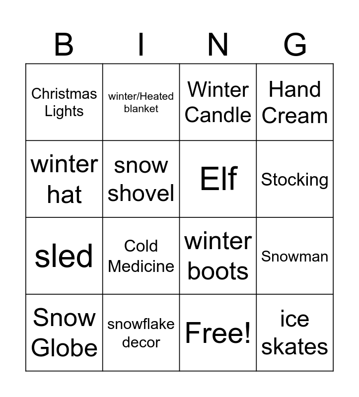 This bingo card has 17 words: Free!, Snow Globe, Winter Candle, Christmas Lights, Cold Medicine, Hand Cream, Snowman, Elf, Stocking, snow shovel, snowflake decor, winter boots, winter hat, winter/Heated blanket, sled, Snow skis and ice skates.