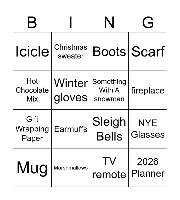 This bingo card has 26 words: Free!, ice skates, fireplace, space heater, Hot Chocolate Mix, Icicle, Winter gloves, Christmas sweater, TV remote, Christmas ornament, Gift Wrapping Paper, Sleigh Bells, Door Wreath, 2026 Calendar, NYE Glasses, Tree Star, Scarf, 2026 Planner, Boots, Mug, Earmuffs, Scarf, Marshmallows, Snow Brush, Something With A snowman and Snow Globe.