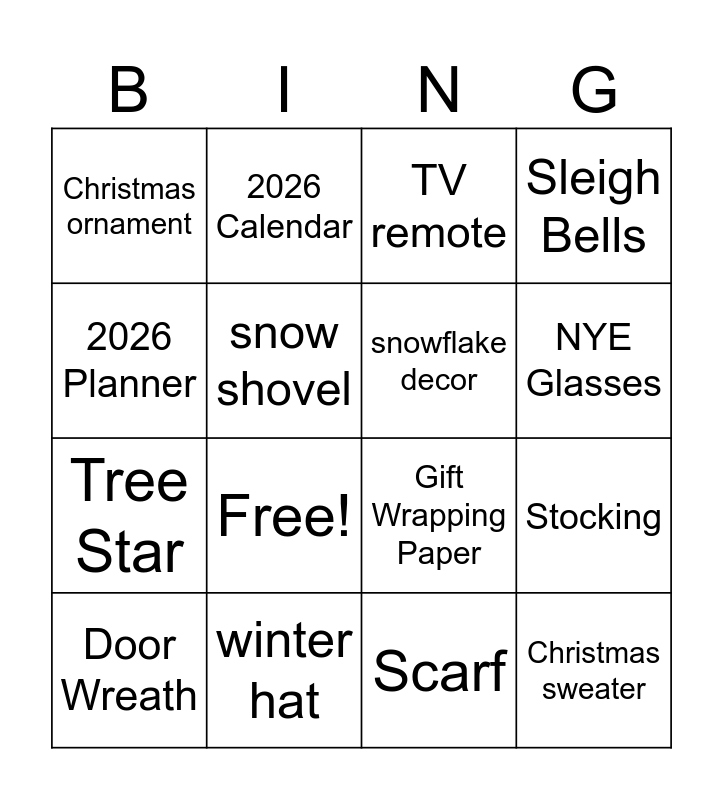 This bingo card has 18 words: Free!, Christmas sweater, TV remote, Christmas ornament, Gift Wrapping Paper, Sleigh Bells, Door Wreath, 2026 Calendar, NYE Glasses, Tree Star, Scarf, 2026 Planner, Stocking, snow shovel, snowflake decor, winter boots, winter hat and winter/Heated blanket.