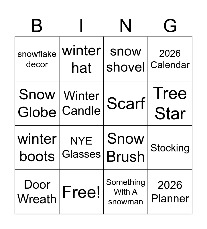This bingo card has 16 words: Free!, Stocking, snow shovel, snowflake decor, winter boots, winter hat, Snow Brush, Something With A snowman, Snow Globe, Winter Candle, Door Wreath, 2026 Calendar, NYE Glasses, Tree Star, Scarf and 2026 Planner.