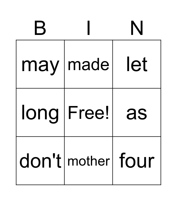 This bingo card has a free space and 8 words: as, let, made, don't, may, four, long and mother.