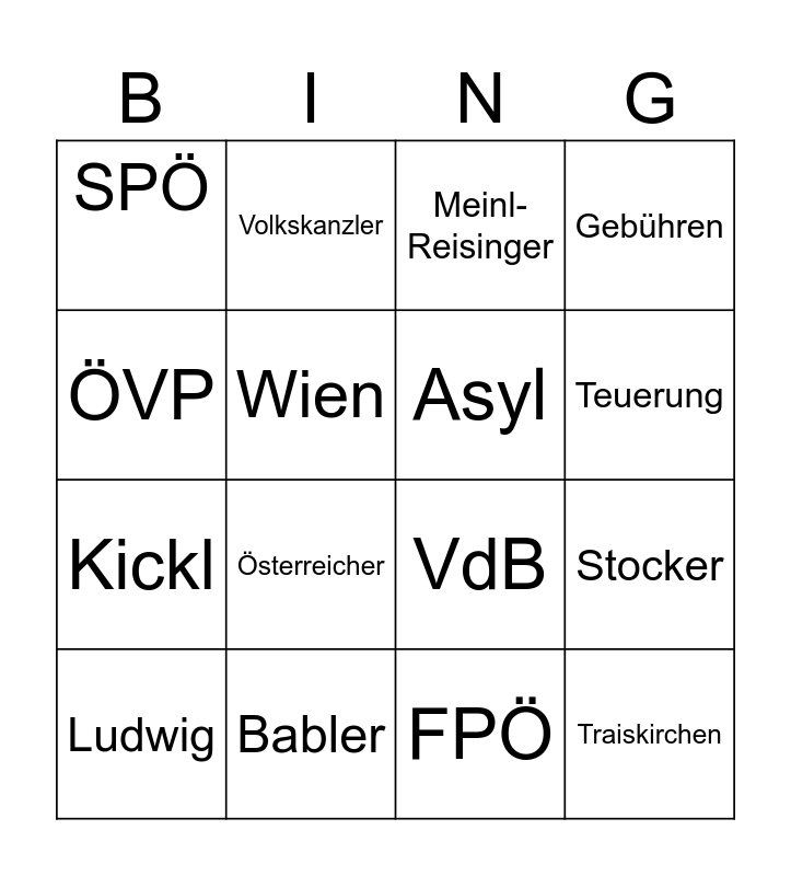 This bingo card has 16 words: Babler, Stocker, Meinl-Reisinger, SPÖ, Kickl, Volkskanzler, VdB, FPÖ, ÖVP, Wien, Ludwig, Gebühren, Österreicher, Teuerung, Asyl and Traiskirchen.