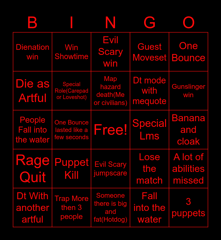 This bingo card has a free space and 24 words: Puppet Kill, Trap More then 3 people, Map hazard death(Me or civilians), Dt With another artful, One Bounce, Dienation win, Die as Artful, Win Showtime, Special Lms, Evil Scary jumpscare, Dt mode with mequote, People Fall into the water, Lose the match, A lot of abilities missed, Special Role(Carepad or Loveshot), Fall into the water, Banana and cloak, Evil Scary win, Gunslinger win, One Bounce lasted like a few seconds, 3 puppets, Rage Quit, Guest Moveset and Someone there is big and fat(Hotdog).