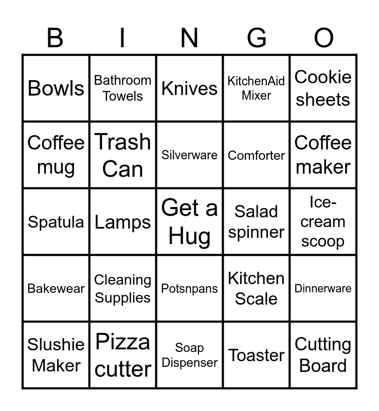 This bingo card has a free space and 29 words: Slushie Maker, Vacuum, Lamps, Crockpot, Bowls, Knives, Trash Can, Cleaning Supplies, Salad spinner, Pizza cutter, Ice-cream scoop, Cutting Board, Soap Dispenser, Toaster, Coffee maker, Air Fryer, Potsnpans, Bakewear, Cookie sheets, Spatula, Kitchen Scale, Bed Sheets, Comforter, Coffee mug, KitchenAid Mixer, Bathroom Towels, Dinnerware, Silverware and Kitchen Towels.