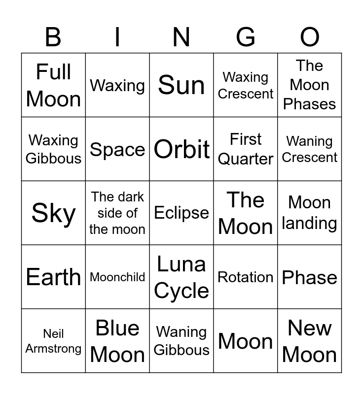 This bingo card has a free space and 32 words: Moon, Full Moon, The dark side of the moon, Luna, Earth, Space, The Moon Phases, Phase, Waxing, Waxing, Orbit, Sun, Freezing at Night, Hot by day, The Moon, Gravity, Neil Armstrong, Sky, Luna Cycle, Moonchild, Rotation, Stars, Moon landing, Blue Moon, New Moon, Waxing Crescent, First Quarter, Waxing Gibbous, Full Moon, Waning Gibbous, Third Quarter (Last Quarter) and Waning Crescent.