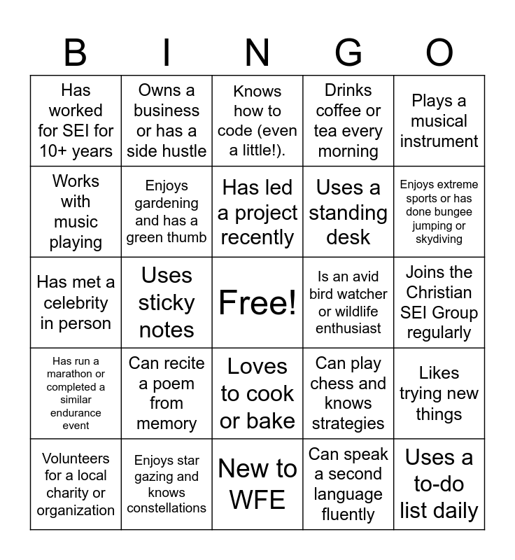 This bingo card has a free space and 34 words: Grew up in a different country, Can speak a second language fluently, Practices yoga or meditation regularly, Has a hidden talent most people don’t know about, Has run a marathon or completed a similar endurance event, Enjoys gardening and has a green thumb, Plays a musical instrument, Volunteers for a local charity or organization, Owns a business or has a side hustle, Watches reality TV shows, Has led a project recently, Knows how to code (even a little!)., Has worked at SEI for more than 5 years, Has a unique hobby, Is an avid bird watcher or wildlife enthusiast, Enjoys extreme sports or has done bungee jumping or skydiving, Enjoys star gazing and knows constellations, Has met a celebrity in person, Can recite a poem from memory, Can play chess and knows strategies, Loves to cook or bake, Has a walking pad for work, Has worked for SEI for 10+ years, Joins the Christian SEI Group regularly, New to WFE, Uses a to-do list daily, Drinks coffee or tea every morning, Has a go-to lunch spot, Uses a standing desk, Works with music playing, Keeps snacks nearby during work, Uses sticky notes, Likes trying new things and Is a planner.