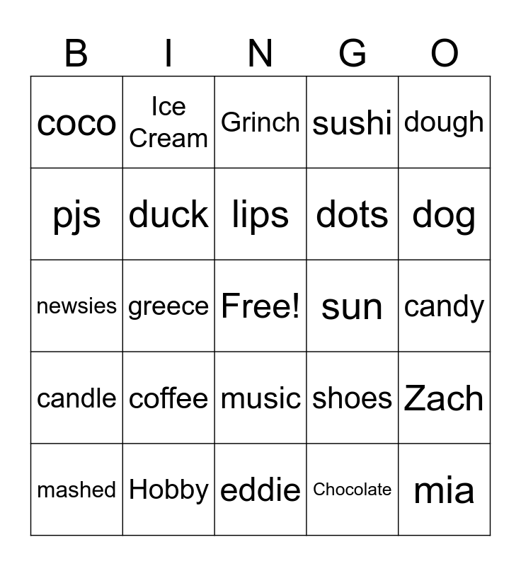 This bingo card has 39 words: books, tj, simps, duck, mashed, music, lips, snacks, dough, candle, greece, sushi, Free!, candy, sun, coffee, ham, coco, chips, shoes, pjs, eddie, dots, dog, texas, bow, mia, Spike, Dr, Ice Cream, tub, fries, Grinch, Hobby, Chocolate, cards, Zach, newsies and Flowers.