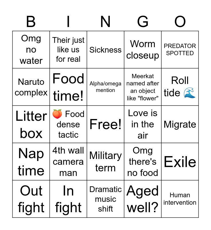This bingo card has a free space and 36 words: Winter is coming, Meerkat pups, Territory mention, Food time!, Omg there's no food, Nap time, Alpha/omega mention, Sentry moment, PREDATOR SPOTTED, Steal yo food, 🍑 Food dense tactic, Worm closeup, B plot Introduced, Love is in the air, Roll tide 🌊, Omg no water, Weather event, 4th wall camera man, Human intervention, Sickness, Migrate, Exile, In fight, Out fight, Dramatic music shift, Their just like us for real, Litter box, Meerkat named an incredibly human name like "tim", Meerkat named after an object like "flower", Naruto complex, Global warming mention, Aged poorly, Aged well?, Military term, Circle of life and Grandparent possibility.