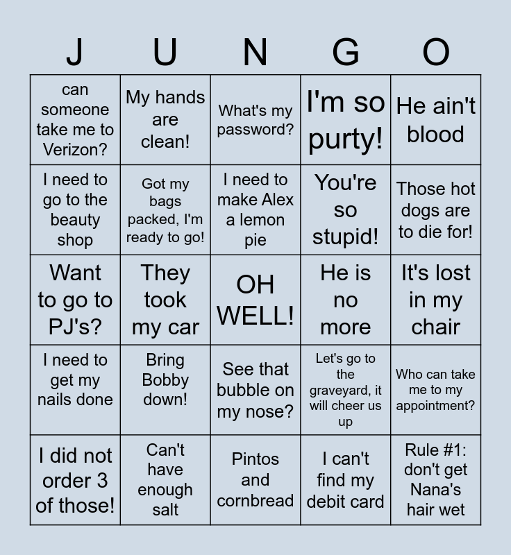 This bingo card has a free space and 34 words: I can't drive anymore, I can't find my debit card, Where is my stylus, Who moved that elephant, I need to get my nails done, Got my bags packed, I'm ready to go!, He ain't blood, I did not order 3 of those!, My hands are clean!, Ready for the rapture!, I need to make Alex a lemon pie, What's my password?, TRACY did it!, Who has my black coat?, He is no more, Those hot dogs are to die for!, Can't have enough salt, Want to go to PJ's?, Bring Bobby down!, Let's go to the graveyard, it will cheer us up, See that bubble on my nose?, Julia is my uber driver, can someone take me to Verizon?, It's lost in my chair, Pintos and cornbread, Rule #1: don't get Nana's hair wet, I'm so purty!, Somebody fix my birdfeeder, You're so stupid!, I need to go to the beauty shop, pitch it down the hill, They took my car, Who can take me to my appointment? and I ain't going to worry about it!.