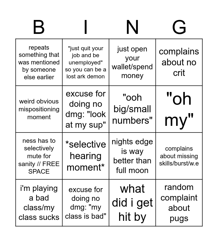 This bingo card has 17 words: what did i get hit by, i'm playing a bad class/my class sucks, just open your wallet/spend money, repeats something that was mentioned by someone else earlier, *selective hearing moment*, complains about no crit, complains about missing skills/burst/w.e, "ooh big/small numbers", "oh my", excuse for doing no dmg: "look at my sup", excuse for doing no dmg: "my class is bad", nights edge is way better than full moon, weird obvious mispositioning moment, "just quit your job and be unemployed" so you can be a lost ark demon, ness has to selectively mute for sanity // FREE SPACE, oh my wild soul is so much better than my other classes and random complaint about pugs.