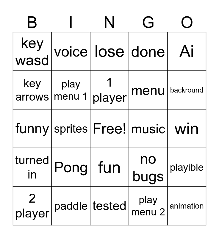 This bingo card has a free space and 24 words: Pong, paddle, 1 player, 2 player, Ai, key wasd, key arrows, voice, music, fun, menu, funny, no bugs, playible, play menu 1, play menu 2, win, lose, backround, sprites, animation, turned in, done and tested.
