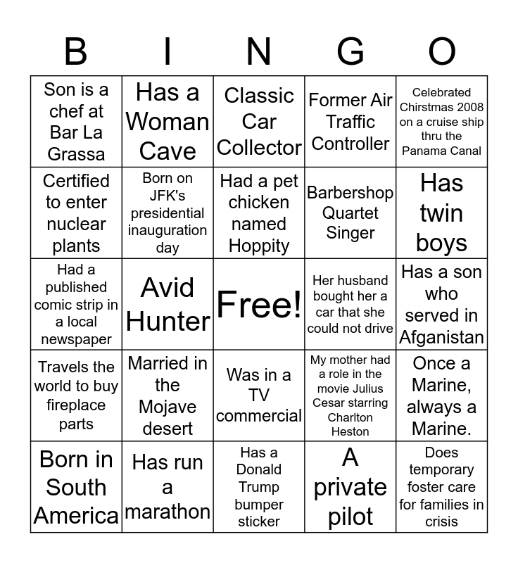 This bingo card has a free space and 24 words: Married in the Mojave desert, Has run a marathon, Had a pet chicken named Hoppity, Born in South America, Celebrated Chirstmas 2008 on a cruise ship thru the Panama Canal, Son is a chef at Bar La Grassa, Certified to enter nuclear plants, Has a Woman Cave, Her husband bought her a car that she could not drive, Was in a TV commercial, Barbershop Quartet Singer, Had a published comic strip in a local newspaper, My mother had a role in the movie Julius Cesar starring Charlton Heston, Once a Marine, always a Marine., Born on JFK's presidential inauguration day, A private pilot, Has a son who served in Afganistan, Classic Car Collector, Has twin boys, Avid Hunter, Does temporary foster care for families in crisis, Travels the world to buy fireplace parts, Former Air Traffic Controller and Has a Donald Trump bumper sticker.