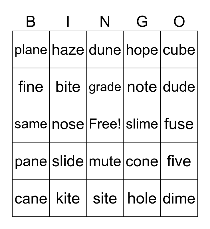 This bingo card has a free space and 42 words: wake, grade, game, slide, hole, five, dime, rake, dune, mute, fuse, dude, nose, cube, ride, cone, sage, same, nice, haze, fine, pete, pine, plane, state, shade, note, mane, cape, tape, made, pane, bite, site, hate, cane, kite, slime, cute, globe, hope and tube.