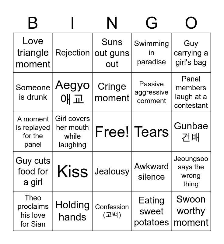 This bingo card has a free space and 24 words: Kiss, Holding hands, Cringe moment, Theo proclaims his love for Sian, Guy carrying a girl's bag, Love triangle moment, Someone is drunk, Rejection, Tears, Jealousy, Passive aggressive comment, A moment is replayed for the panel, Awkward silence, Jeoungsoo says the wrong thing, Aegyo 애교, Eating sweet potatoes, Gunbae 건배, Suns out guns out, Panel members laugh at a contestant, Girl covers her mouth while laughing, Swoon worthy moment, Guy cuts food for a girl, Swimming in paradise and Confession (고백).