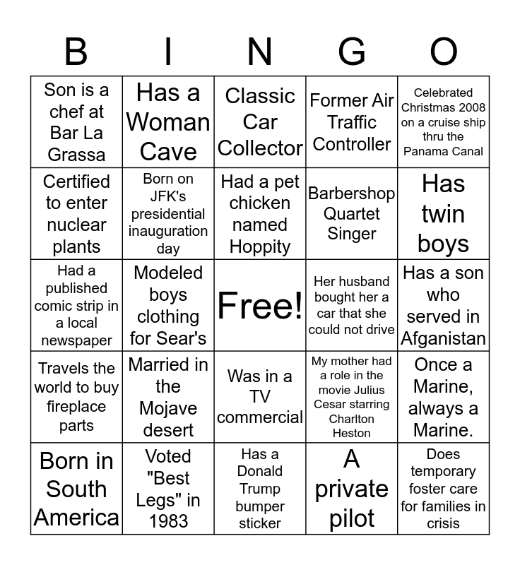 This bingo card has a free space and 24 words: Married in the Mojave desert, Voted "Best Legs" in 1983, Had a pet chicken named Hoppity, Born in South America, Celebrated Christmas 2008 on a cruise ship thru the Panama Canal, Son is a chef at Bar La Grassa, Certified to enter nuclear plants, Has a Woman Cave, Her husband bought her a car that she could not drive, Was in a TV commercial, Barbershop Quartet Singer, Had a published comic strip in a local newspaper, My mother had a role in the movie Julius Cesar starring Charlton Heston, Once a Marine, always a Marine., Born on JFK's presidential inauguration day, A private pilot, Has a son who served in Afganistan, Classic Car Collector, Has twin boys, Modeled boys clothing for Sear's, Does temporary foster care for families in crisis, Travels the world to buy fireplace parts, Former Air Traffic Controller and Has a Donald Trump bumper sticker.