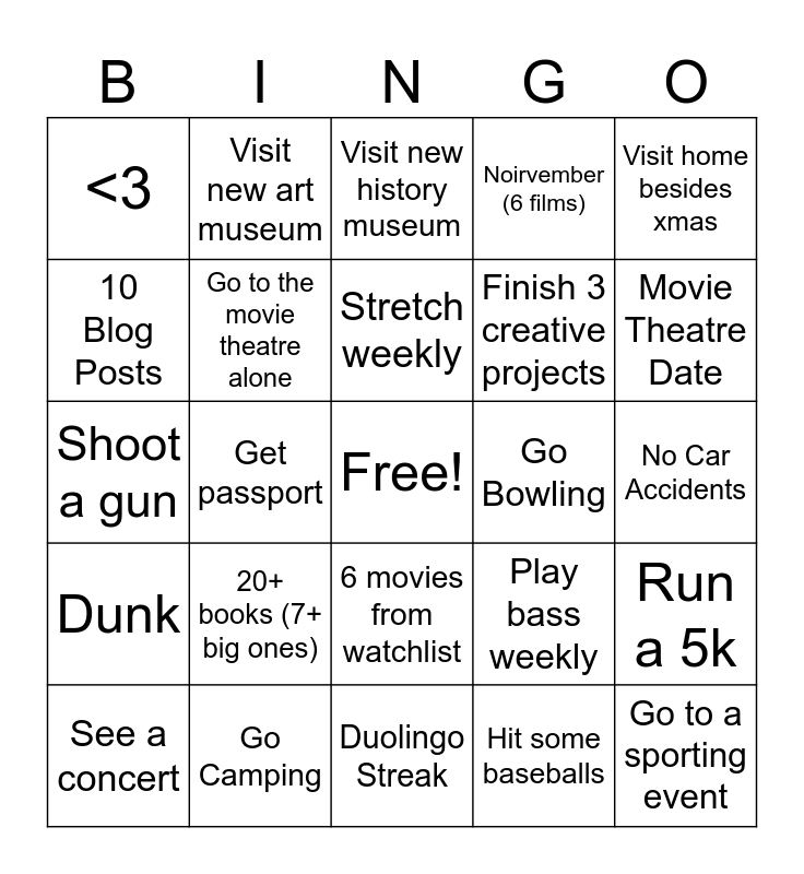 This bingo card has a free space and 24 words: 20+ books (7+ big ones), Go Camping, Stretch weekly, See a concert, Visit home besides xmas, <3, 10 Blog Posts, Visit new art museum, Go Bowling, 6 movies from watchlist, Finish 3 creative projects, Shoot a gun, Play bass weekly, Run a 5k, Go to the movie theatre alone, Hit some baseballs, No Car Accidents, Visit new history museum, Movie Theatre Date, Get passport, Go to a sporting event, Dunk, Noirvember (6 films) and Duolingo Streak.