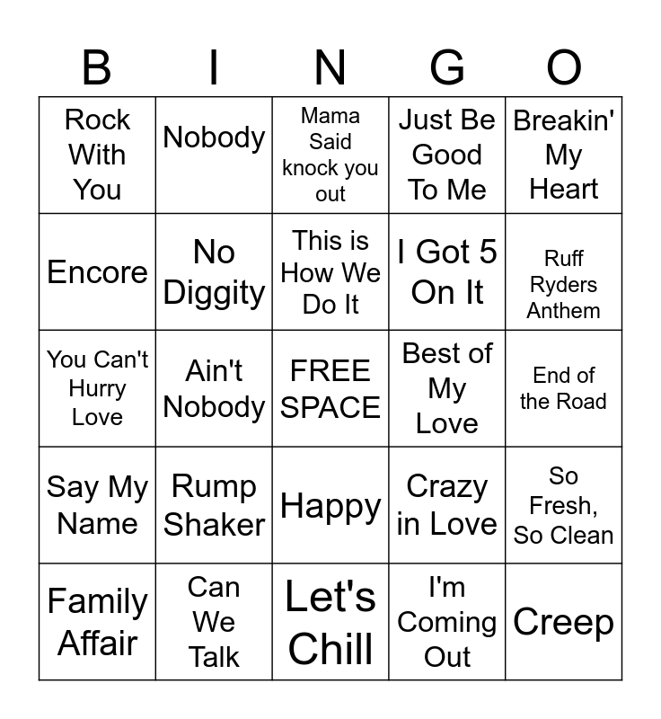 This bingo card has a free space and 35 words: Summertime, No Scrubs, Whatta Man, No Diggity, Happy, Just Be Good To Me, Encore, Square Biz, This is How We Do It, Poison, You Can't Hurry Love, Breakin' My Heart, And the Beat Goes On, September, Rock With You, Best of My Love, I'm Coming Out, Ain't Nobody, Say My Name, Creep, Crazy in Love, Family Affair, So Fresh, So Clean, Can We Talk, Mama Said knock you out, Ruff Ryders Anthem, Gin & Juice, Back that thang up, I Got 5 On It, End of the Road, On & On, Let's Chill, Rump Shaker, Nobody and California Love.