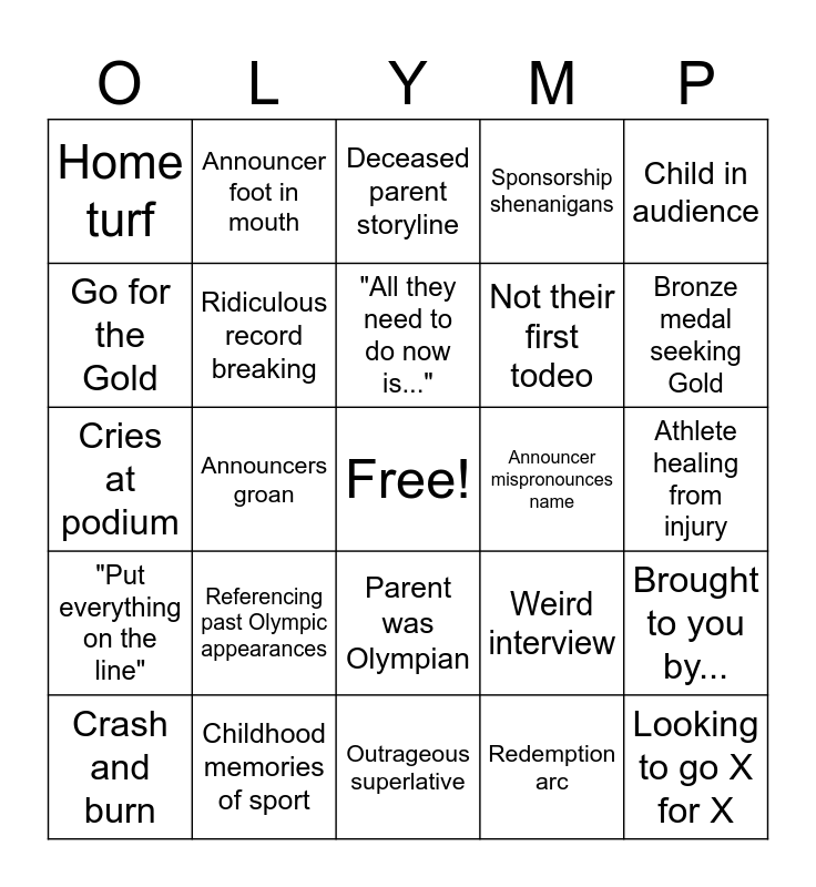 This bingo card has a free space and 24 words: Referencing past Olympic appearances, Childhood memories of sport, "All they need to do now is...", Crash and burn, Child in audience, Home turf, Go for the Gold, Announcer foot in mouth, Announcer mispronounces name, Parent was Olympian, Not their first todeo, Cries at podium, Weird interview, Brought to you by..., Ridiculous record breaking, Redemption arc, Athlete healing from injury, Deceased parent storyline, Bronze medal seeking Gold, Announcers groan, Looking to go X for X, "Put everything on the line", Sponsorship shenanigans and Outrageous superlative.