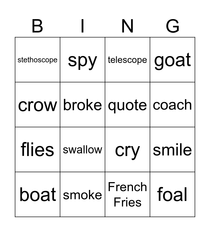 This bingo card has 16 words: smoke, smile, telescope, stethoscope, flies, spy, cry, French Fries, crow, broke, boat, goat, swallow, coach, quote and foal.