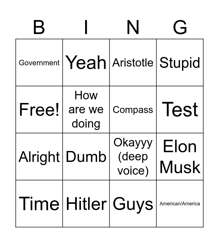 This bingo card has 16 words: Hitler, Elon Musk, Aristotle, Government, Alright, Yeah, Okayyy (deep voice), Guys, Free!, How are we doing, Time, Stupid, Dumb, Test, Compass and American/America.