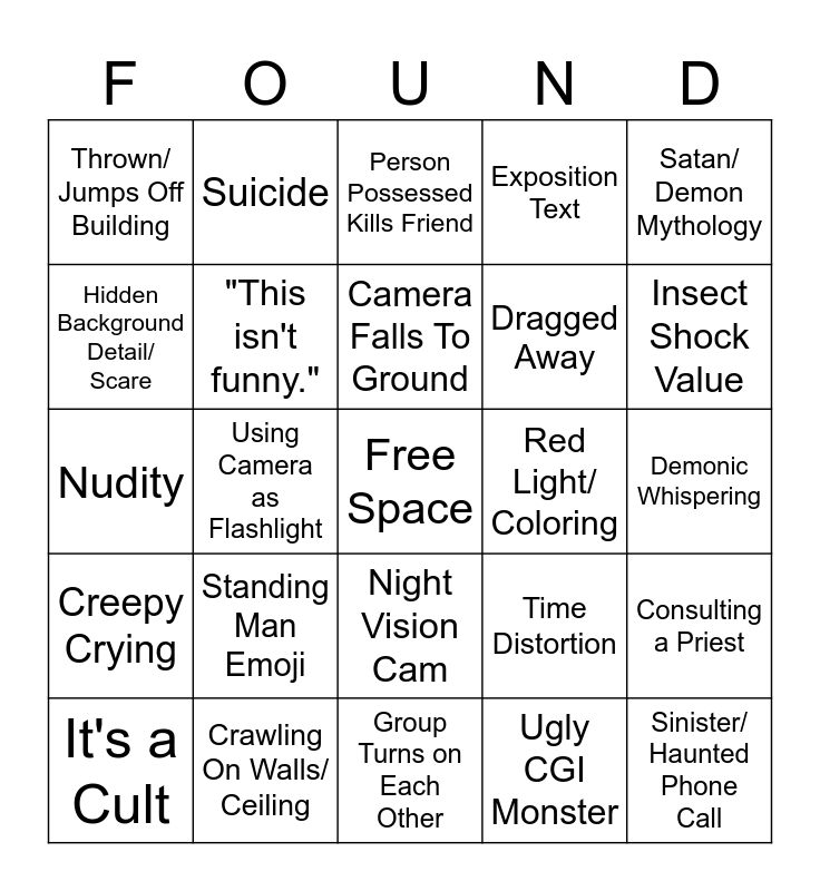 This bingo card has a free space and 24 words: Standing Man Emoji, Crawling On Walls/ Ceiling, Camera Falls To Ground, It's a Cult, Satan/ Demon Mythology, Thrown/ Jumps Off Building, Hidden Background Detail/ Scare, Suicide, Red Light/ Coloring, Night Vision Cam, Dragged Away, Nudity, Time Distortion, Consulting a Priest, "This isn't funny.", Ugly CGI Monster, Demonic Whispering, Person Possessed Kills Friend, Insect Shock Value, Using Camera as Flashlight, Sinister/ Haunted Phone Call, Creepy Crying, Exposition Text and Group Turns on Each Other.