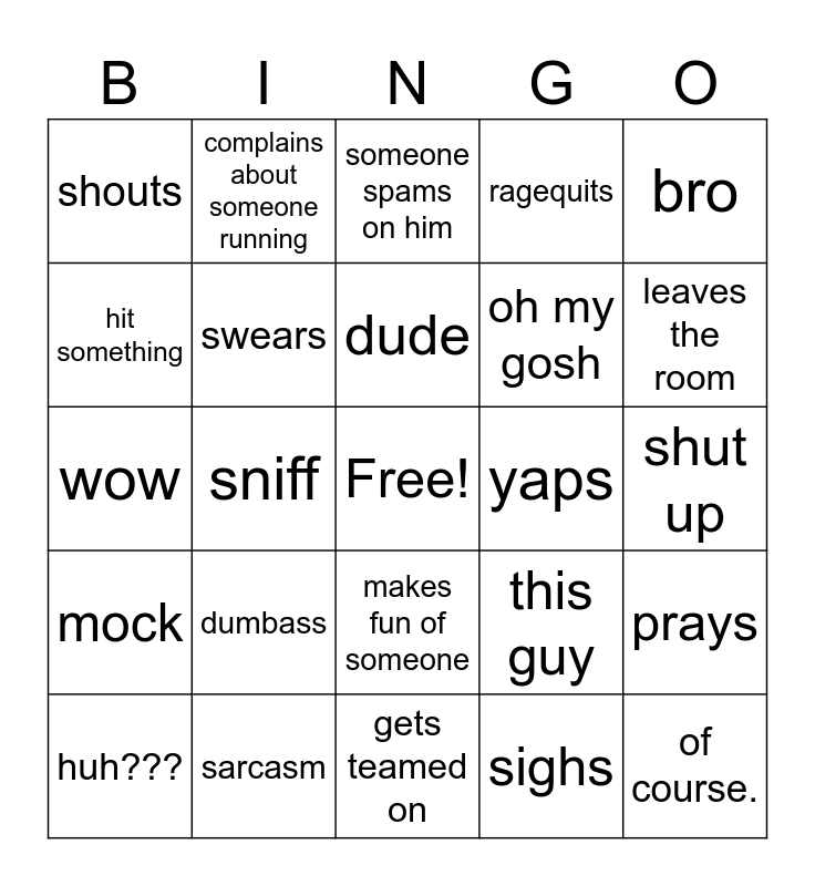 This bingo card has a free space and 24 words: dumbass, sarcasm, dude, huh???, bro, shouts, hit something, complains about someone running, yaps, makes fun of someone, oh my gosh, wow, this guy, prays, swears, sighs, shut up, someone spams on him, leaves the room, sniff, of course., mock, ragequits and gets teamed on.
