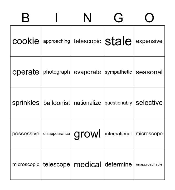 This bingo card has 35 words: connection, childhood, visit, photograph, growl, stale, operate, traffic, evaporate, fragment, sprinkles, expensive, foolishness, attractive, cookie, questionably, determine, balloonist, possessive, nationalize, international, microscopic, microscope, telescope, telescopic, seasonal, unapproachable, quietness, sympathetic, selective, magnetic, medical, disappearance, approaching and symphony.