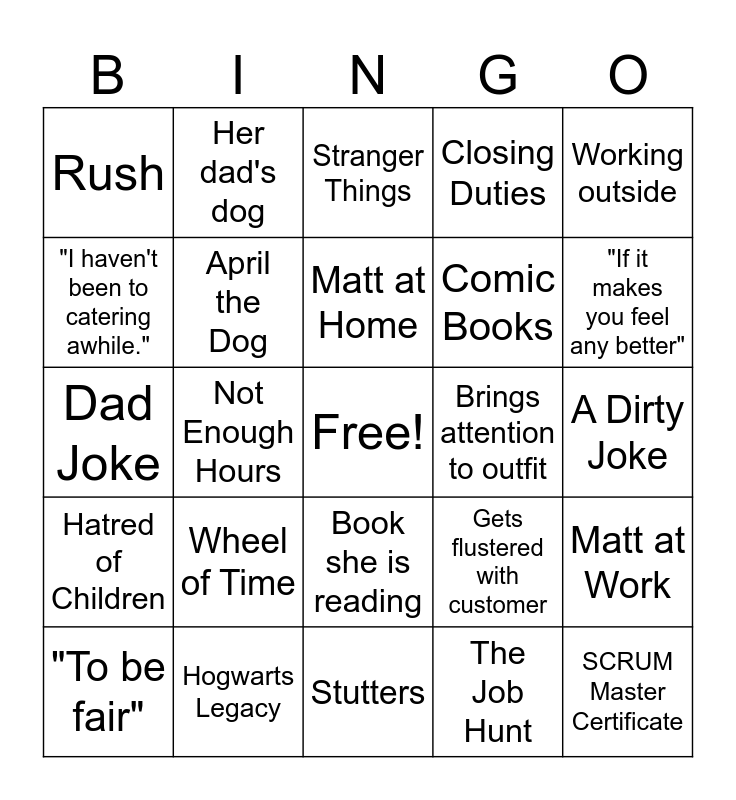 This bingo card has a free space and 24 words: Wheel of Time, Hogwarts Legacy, Matt at Home, "To be fair", Working outside, Rush, "I haven't been to catering awhile.", Her dad's dog, Brings attention to outfit, Book she is reading, Comic Books, Dad Joke, Gets flustered with customer, Matt at Work, April the Dog, The Job Hunt, A Dirty Joke, Stranger Things, "If it makes you feel any better", Not Enough Hours, SCRUM Master Certificate, Hatred of Children, Closing Duties and Stutters.