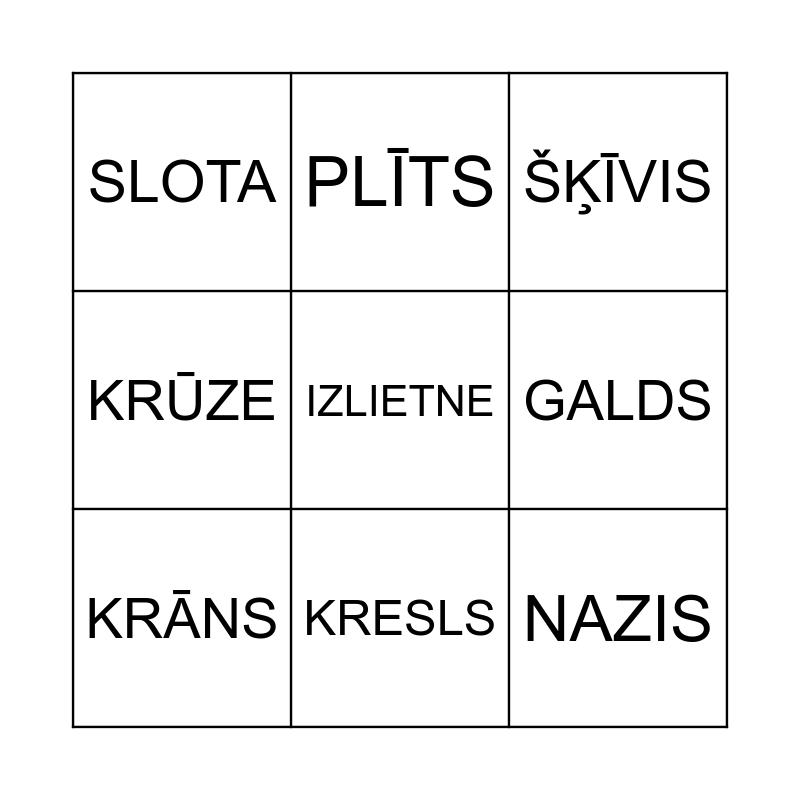 This bingo card has a free space and 8 words: GALDS, ŠĶĪVIS, PLĪTS, KRĀNS, SLOTA, NAZIS, KRŪZE and KRESLS.