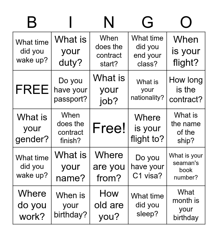 This bingo card has a free space and 25 words: What is your name?, How old are you?, What is your job?, Where do you work?, When is your flight?, What time did you wake up?, FREE, What is your duty?, Where is your flight to?, Where are you from?, What is your nationality?, What is your gender?, Do you have your C1 visa?, What is your seaman's book number?, Do you have your passport?, What is your passport number?, What is the name of the ship?, When does the contract start?, How long is the contract?, When does the contract finish?, What month is your birthday, When is your birthday?, What time did you wake up?, What time did you end your class? and What time did you sleep?.
