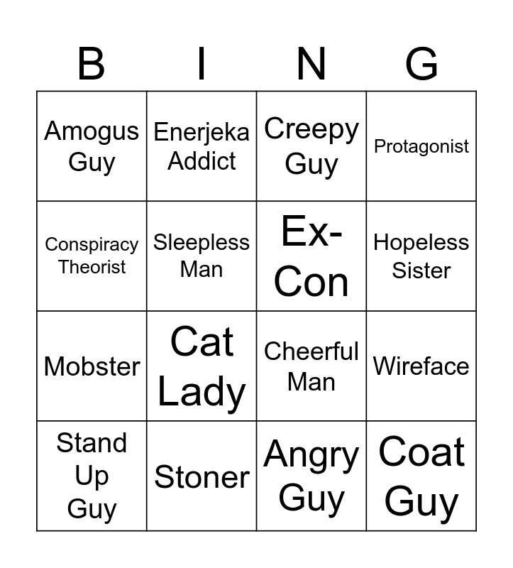 This bingo card has 19 words: Cheerful Man, Armchair Lawyer Guy, Creepy Guy, Coat Guy, Wireface, Conspiracy Theorist, Angry Guy, Amogus Guy, Enerjeka Addict, Mobster, Cat Lady, Sleepless Man, Ex-Con, Stoner, Stand Up Guy, Ex-Minister, Protagonist, Hopeless Sister and Little Girl.