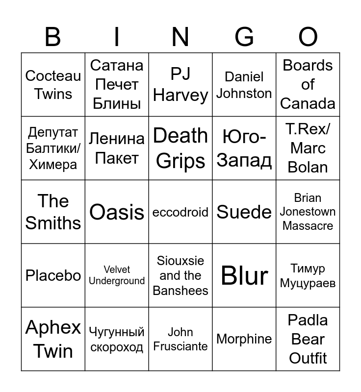 This bingo card has 25 words: Velvet Underground, John Frusciante, Death Grips, Aphex Twin, Boards of Canada, Cocteau Twins, Депутат Балтики/ Химера, Сатана Печет Блины, Suede, Siouxsie and the Banshees, Юго-Запад, The Smiths, Blur, Тимур Муцураев, Ленина Пакет, Padla Bear Outfit, Brian Jonestown Massacre, PJ Harvey, T.Rex/ Marc Bolan, Oasis, eccodroid, Чугунный скороход, Placebo, Daniel Johnston and Morphine.