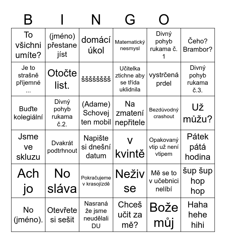 This bingo card has 39 words: Otevřete si sešit, No (jméno)., Nepovedený vtip, Je to strašně příjemné ..., Napište si dnešní datum, Už můžu?, Otočte list., Haha hehe hihi, Divný pohyb rukama č. 1, Na zmatení nepřitele, Divný pohyb rukama č.3., Matematický nesmysl, Buďte kolegiální, (Adame) Schovej ten mobil, Divný pohyb rukama č.2., Bezdůvodný crashout, Mě se to v učebnici nelíbí, To všichni umíte?, Nasraná že jsme neudělali DU, Jsme ve skluzu, Čeho? Brambor?, Opakovaný vtip už není vtipem, šššššššš, Učitelka ztichne aby se třída uklidnila, Chceš učit za mě?, Pokračujeme v krasojízdě, Ach jo, Bože můj, No sláva, (jméno) přestane jíst, Ale už dost, šup šup hop hop, domácí úkol, v kvintě, Pátek pátá hodina, Neživ se, Dvakrát podtrhnout, vystrčená prdel and u nás na valašsku.