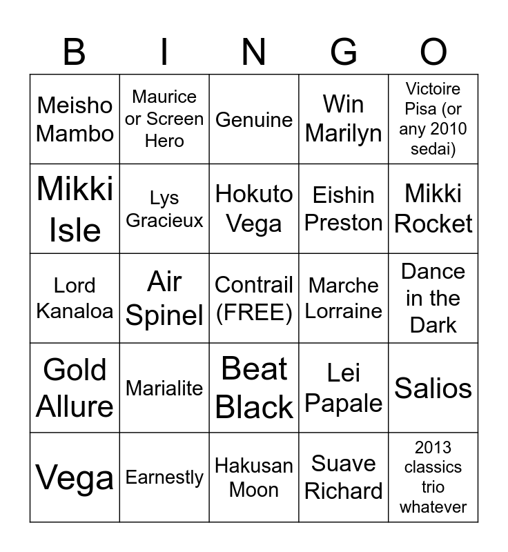 This bingo card has a free space and 24 words: Marialite, Earnestly, Hokuto Vega, Vega, Victoire Pisa (or any 2010 sedai), Meisho Mambo, Mikki Isle, Maurice or Screen Hero, Marche Lorraine, Beat Black, Eishin Preston, Lord Kanaloa, Lei Papale, Salios, Lys Gracieux, Suave Richard, Dance in the Dark, Genuine, Mikki Rocket, Air Spinel, 2013 classics trio whatever, Gold Allure, Win Marilyn and Hakusan Moon.
