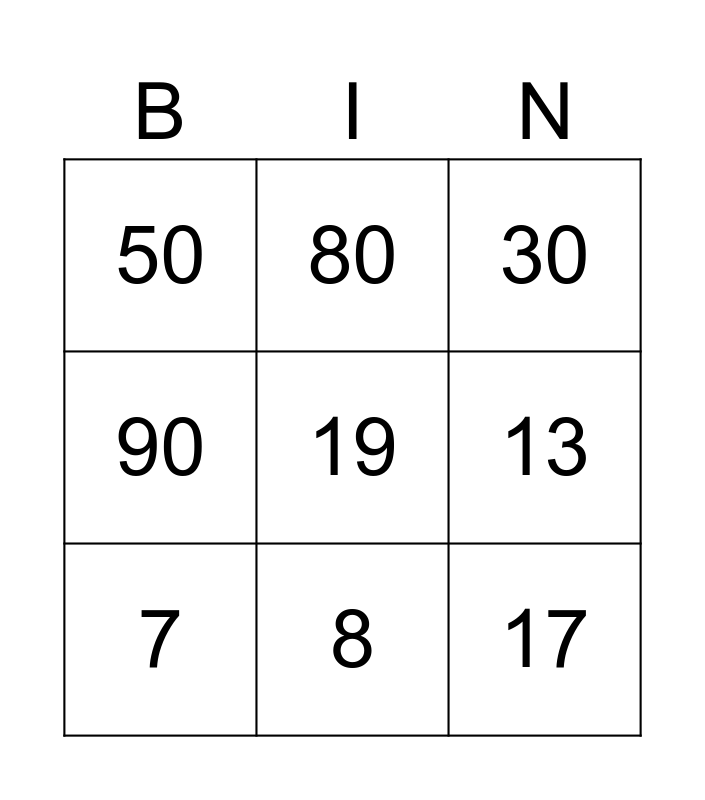 This bingo card has a free space and 8 words: 13, 30, 80, 7, 50, 17, 90 and 8.
