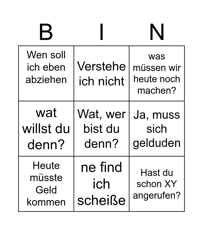 This bingo card has a free space and 8 words: Ja, muss sich gelduden, was müssen wir heute noch machen?, Verstehe ich nicht, Heute müsste Geld kommen, Wen soll ich eben abziehen, Hast du schon XY angerufen?, wat willst du denn? and ne find ich scheiße.
