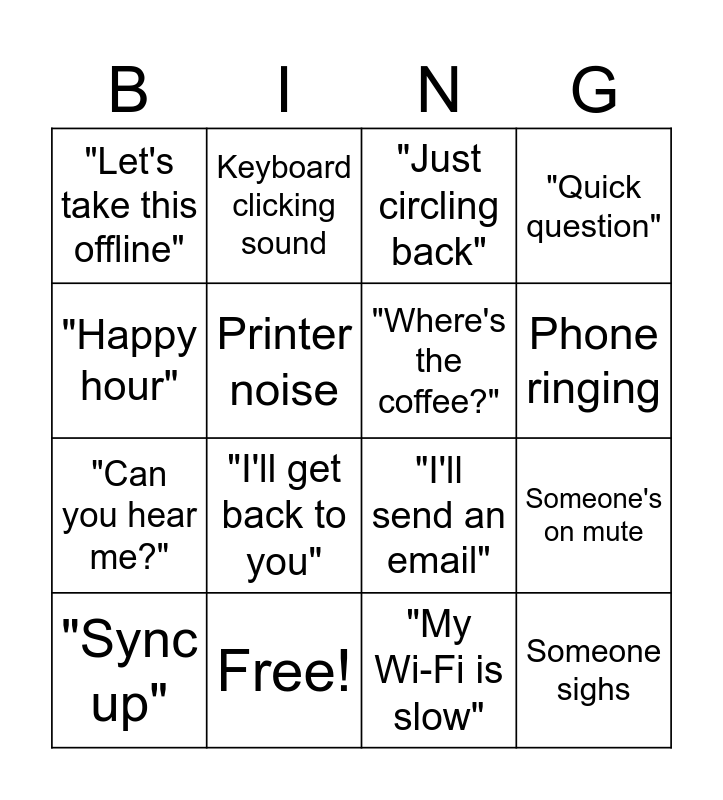 This bingo card has 16 words: Free!, Someone's on mute, "Just circling back", "Let's take this offline", "Can you hear me?", Keyboard clicking sound, "I'll send an email", "My Wi-Fi is slow", "Happy hour", Printer noise, "Sync up", "Quick question", "I'll get back to you", Phone ringing, "Where's the coffee?" and Someone sighs.