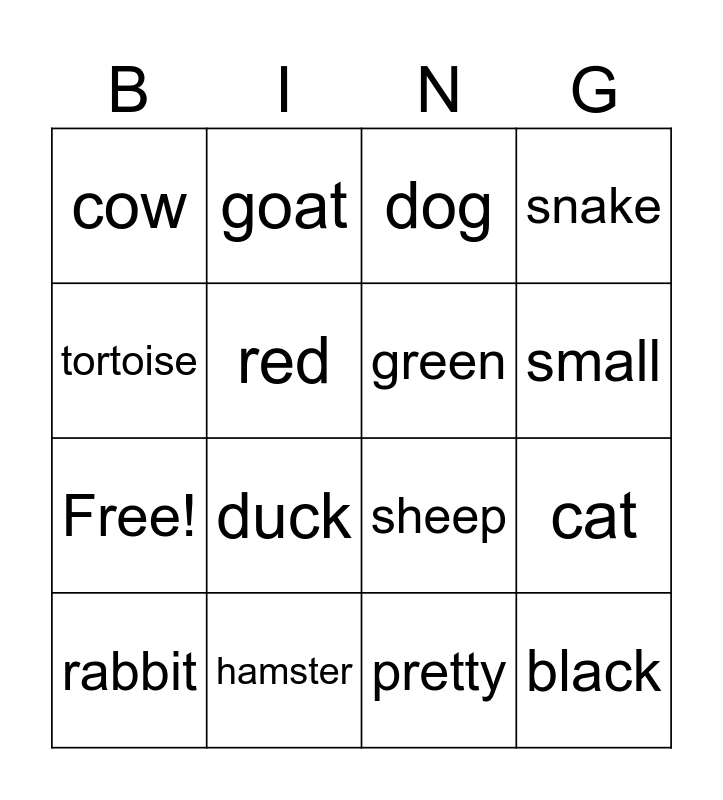 This bingo card has 20 words: cat, bird, dog, fish, rabbit, tortoise, hamster, cow, Free!, goat, duck, sheep, red, black, green, big, small, snake, pretty and spider.