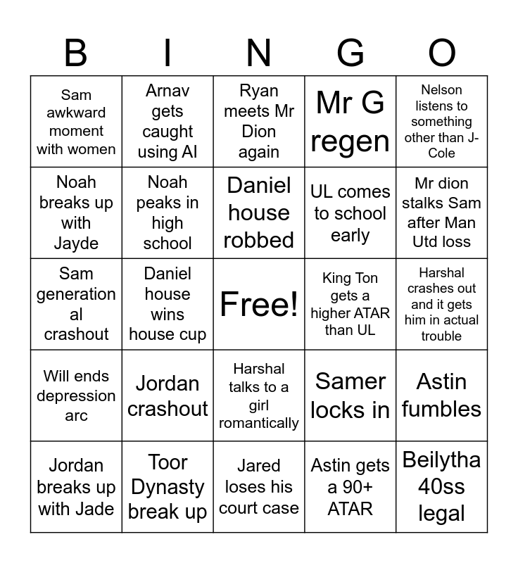 This bingo card has a free space and 24 words: Jordan crashout, Toor Dynasty break up, Daniel house robbed, Jordan breaks up with Jade, Nelson listens to something other than J-Cole, Sam awkward moment with women, Noah breaks up with Jayde, Arnav gets caught using AI, King Ton gets a higher ATAR than UL, Harshal talks to a girl romantically, UL comes to school early, Sam generation al crashout, Samer locks in, Astin fumbles, Noah peaks in high school, Astin gets a 90+ ATAR, Harshal crashes out and it gets him in actual trouble, Ryan meets Mr Dion again, Mr dion stalks Sam after Man Utd loss, Daniel house wins house cup, Beilytha 40ss legal, Will ends depression arc, Mr G regen and Jared loses his court case.