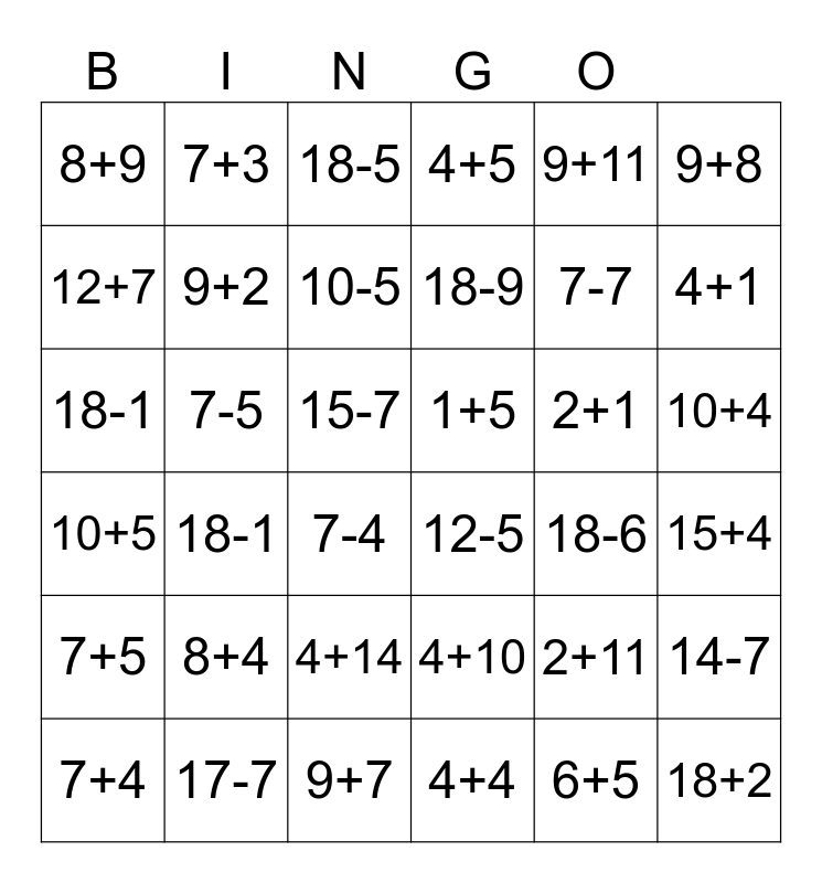 This bingo card has 36 words: 4+10, 4+14, 4+4, 12+7, 10+5, 1+5, 9+2, 9+7, 9+11, 2+11, 4+1, 4+5, 14-7, 7-5, 18-9, 8+9, 7+5, 2+1, 18-1, 18-5, 15-7, 18-1, 12-5, 7-4, 18-6, 7+3, 7-7, 17-7, 10-5, 9+8, 18+2, 7+4, 15+4, 10+4, 8+4 and 6+5.