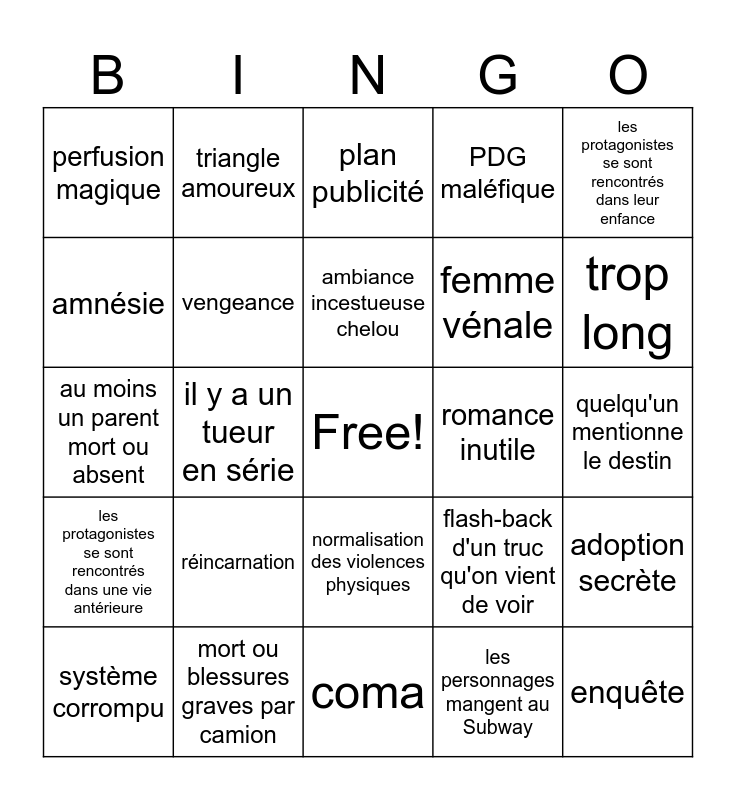 This bingo card has a free space and 24 words: réincarnation, mort ou blessures graves par camion, ambiance incestueuse chelou, système corrompu, les protagonistes se sont rencontrés dans leur enfance, perfusion magique, amnésie, triangle amoureux, romance inutile, normalisation des violences physiques, femme vénale, au moins un parent mort ou absent, flash-back d'un truc qu'on vient de voir, adoption secrète, vengeance, les personnages mangent au Subway, quelqu'un mentionne le destin, plan publicité, trop long, il y a un tueur en série, enquête, les protagonistes se sont rencontrés dans une vie antérieure, PDG maléfique and coma.