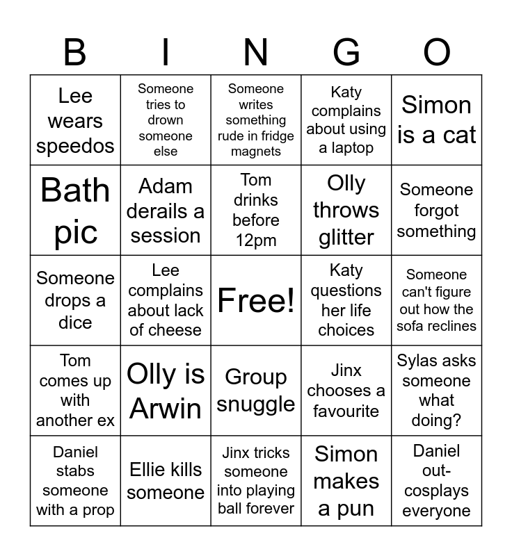 This bingo card has a free space and 24 words: Olly is Arwin, Ellie kills someone, Tom drinks before 12pm, Daniel stabs someone with a prop, Simon is a cat, Lee wears speedos, Bath pic, Someone tries to drown someone else, Katy questions her life choices, Group snuggle, Olly throws glitter, Someone drops a dice, Jinx chooses a favourite, Sylas asks someone what doing?, Adam derails a session, Simon makes a pun, Someone can't figure out how the sofa reclines, Someone writes something rude in fridge magnets, Someone forgot something, Lee complains about lack of cheese, Daniel out-cosplays everyone, Tom comes up with another ex, Katy complains about using a laptop and Jinx tricks someone into playing ball forever.