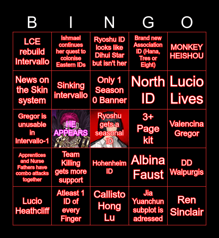This bingo card has 1 images, a free space and 24 words: Team Killing gets more support, Atleast 1 ID of every Finger, Only 1 Season 0 Banner, Lucio Heathcliff, MONKEY HEISHOU, LCE rebuild Intervallo, News on the Skin system, Ishmael continues her quest to colonise Eastern IDs, 3+ Page kit, Hohenheim ID, North ID, Gregor is unusable in Intervallo-1, Albina Faust, DD Walpurgis, Sinking intervallo, Jia Yuanchun subplot is adressed, Valencina Gregor, Ryoshu ID looks like Dihui Star but isn't her, Lucio Lives, HE APPEARS, Ren Sinclair, Apprentices and Nurse Fathers have combo attacks together, Brand new Association ID (Hana, Tres or Eight) and Callisto Hong Lu.