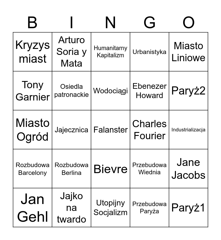 This bingo card has 30 words: Jajko na twardo, Jajko sadzone, Jajecznica, Rewolucja przemysłowa, Kryzys miast, Humanitarny Kapitalizm, Osiedla patronackie, Bievre, Charles Fourier, Utopijny Socjalizm, Industrializacja, Falanster, Przebudowa Paryża, Paryż1, Paryż2, Haussman, Przebudowa Wiednia, Rozbudowa Barcelony, Rozbudowa Berlina, Miasto Liniowe, Miasto Ogród, Miasto Przemysłowe, Arturo Soria y Mata, Ebenezer Howard, Tony Garnier, Urbanistyka, Jane Jacobs, Jan Gehl, Wodociągi and Nowy Urbanizm.