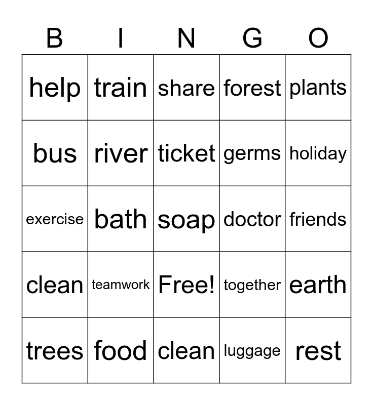 This bingo card has 26 words: Free!, trees, river, animals, forest, plants, bus, train, ticket, luggage, holiday, exercise, food, clean, doctor, rest, help, teamwork, share, together, friends, clean, bath, soap, germs and earth.