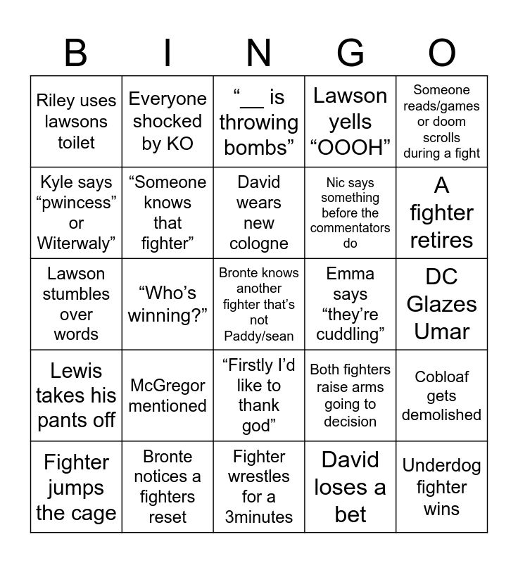 This bingo card has a free space and 24 words: McGregor mentioned, Bronte notices a fighters reset, David wears new cologne, Fighter jumps the cage, Someone reads/games or doom scrolls during a fight, Riley uses lawsons toilet, Kyle says “pwincess” or Witerwaly”, Everyone shocked by KO, Emma says “they’re cuddling”, “Firstly I’d like to thank god”, Nic says something before the commentators do, Lawson stumbles over words, Both fighters raise arms going to decision, Cobloaf gets demolished, “Someone knows that fighter”, David loses a bet, DC Glazes Umar, “__ is throwing bombs”, A fighter retires, “Who’s winning?”, Underdog fighter wins, Lewis takes his pants off, Lawson yells “OOOH” and Fighter wrestles for a 3minutes.