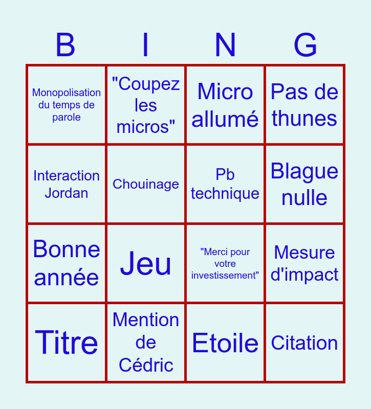 This bingo card has 16 words: Mention de Cédric, Mesure d'impact, Micro allumé, Monopolisation du temps de parole, Bonne année, "Coupez les micros", "Merci pour votre investissement", Etoile, Interaction Jordan, Chouinage, Titre, Pas de thunes, Jeu, Blague nulle, Pb technique and Citation.